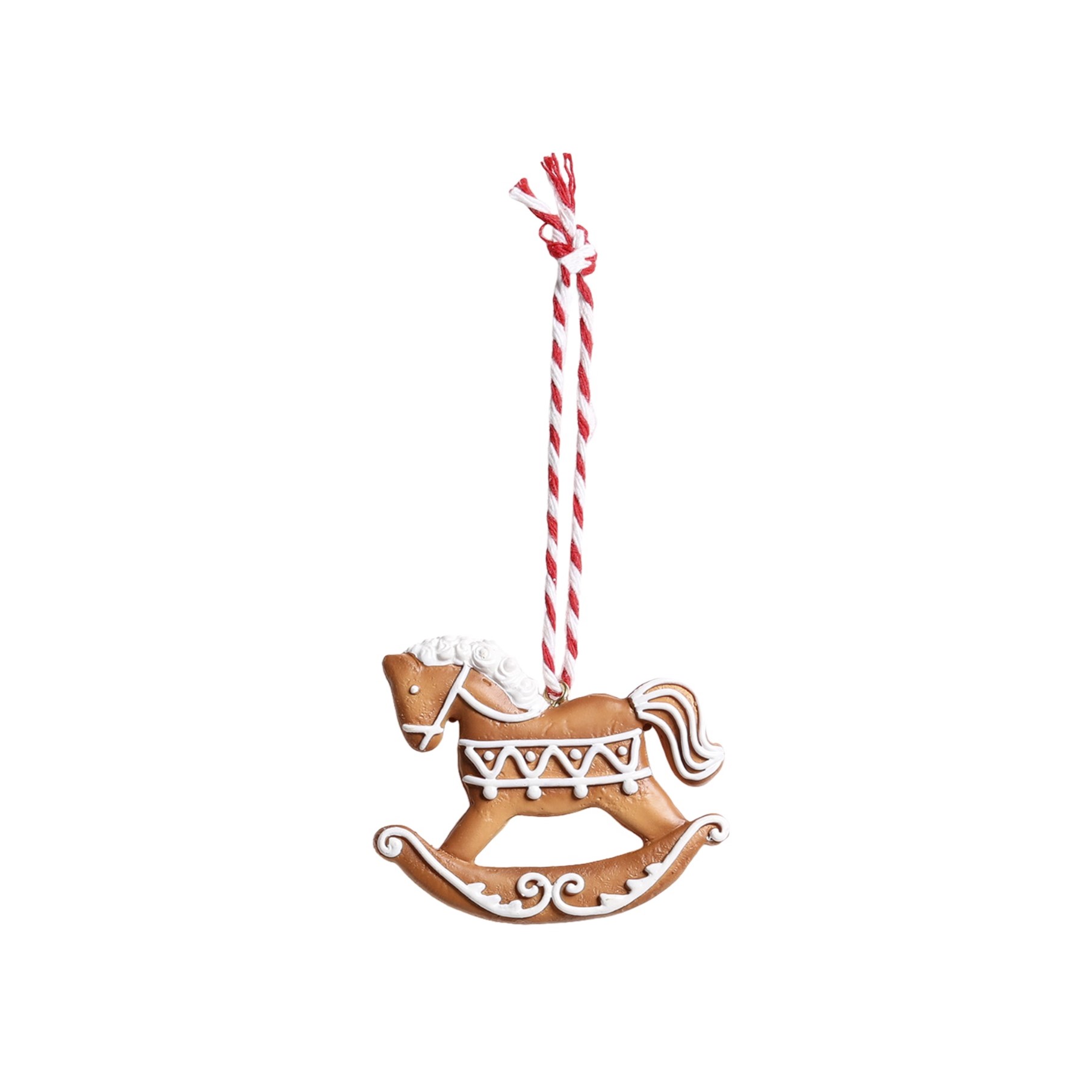 Decorazione da appendere a forma di Cavallo a dondolo Pan di Zenzero. La decorazione ha in dotazione, per essere appesa, il classico cordino natalizio Rosso e Bianco.
