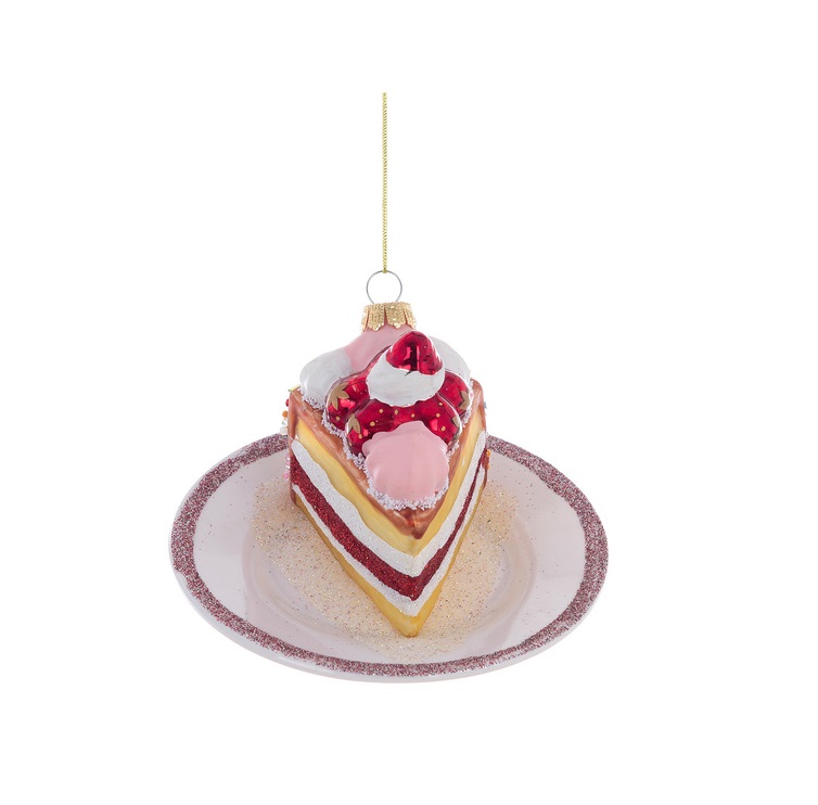 Graziosissima decorazione da appendere a forma di fetta di torta su piattino, deliziosamente decorata con glitter, brillantini e rifinita esternamente con tantissime perline colorate applicate.