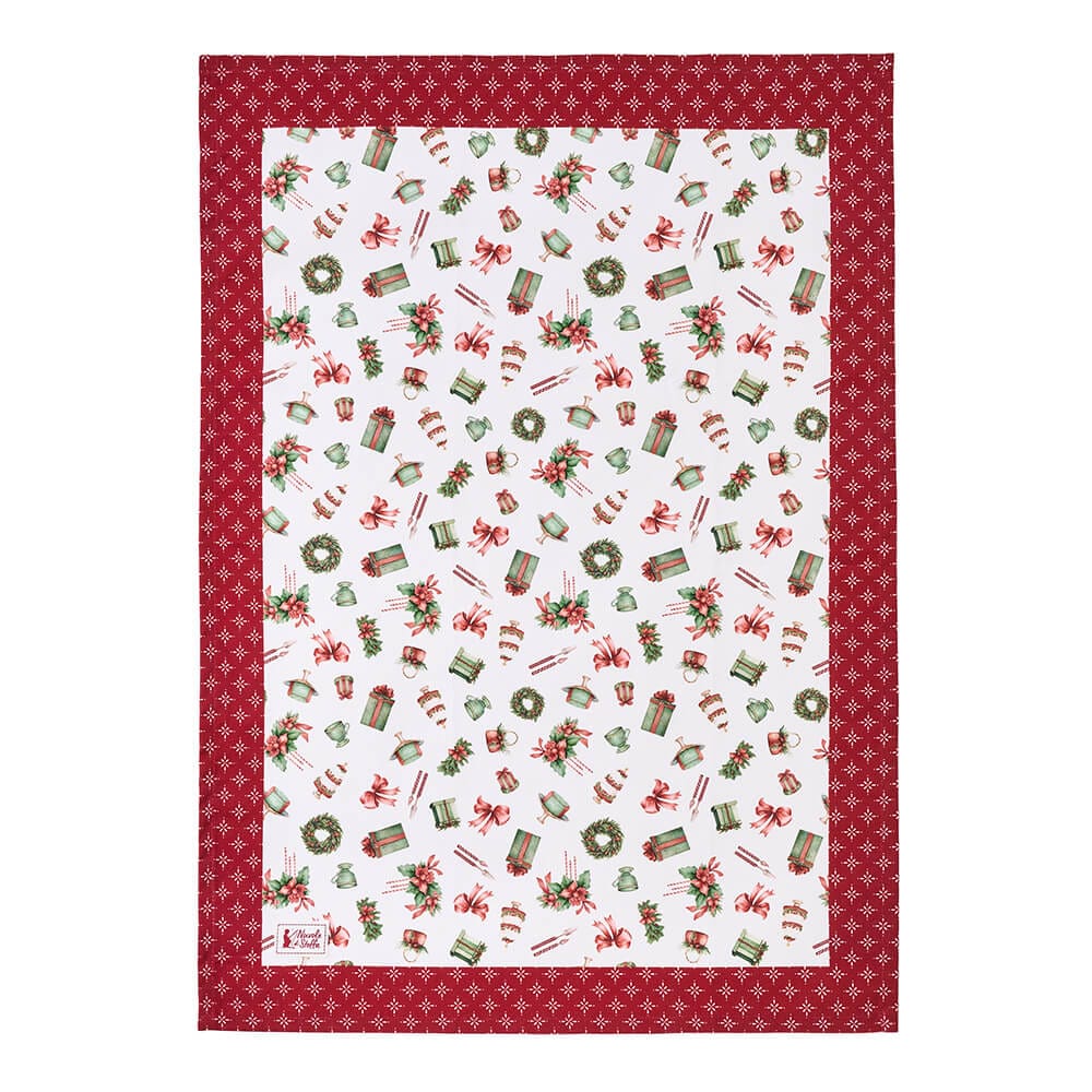 Bellissimo canovaccio realizzato in puro cotone decorato con tanti motivi natalizi sul piano e bordo rosso perimetrale.