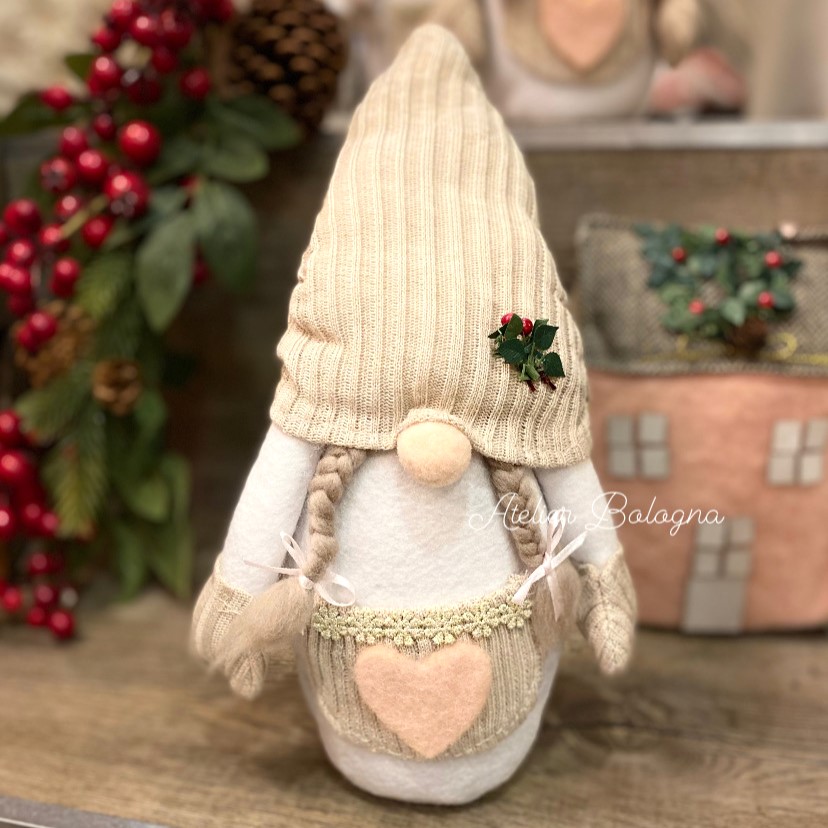 Deliziosa decorazione realizzata in tessuto a forma di gnomo con treccine, cappello lungo, e decoro natalizio applicato sul cappello.