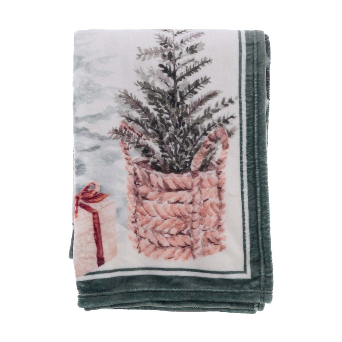 Morbidissimo plaid realizzato in soffice pile con delicata stampa di paesaggio natalizio nei toni del verde tenue su base bianca