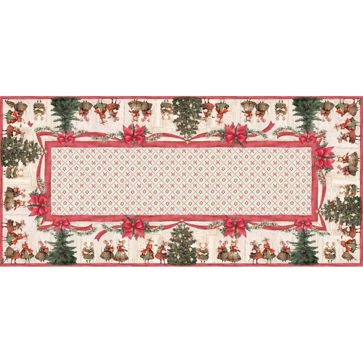 Bellissima tovaglia realizzata in puro cotone con stampa a tema natalizio. La tovaglia è decorata con deliziosi topolini, alberi natalizi e fiocchi Rossi su fondo Avorio chiaro.