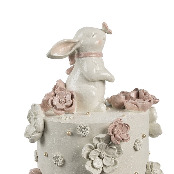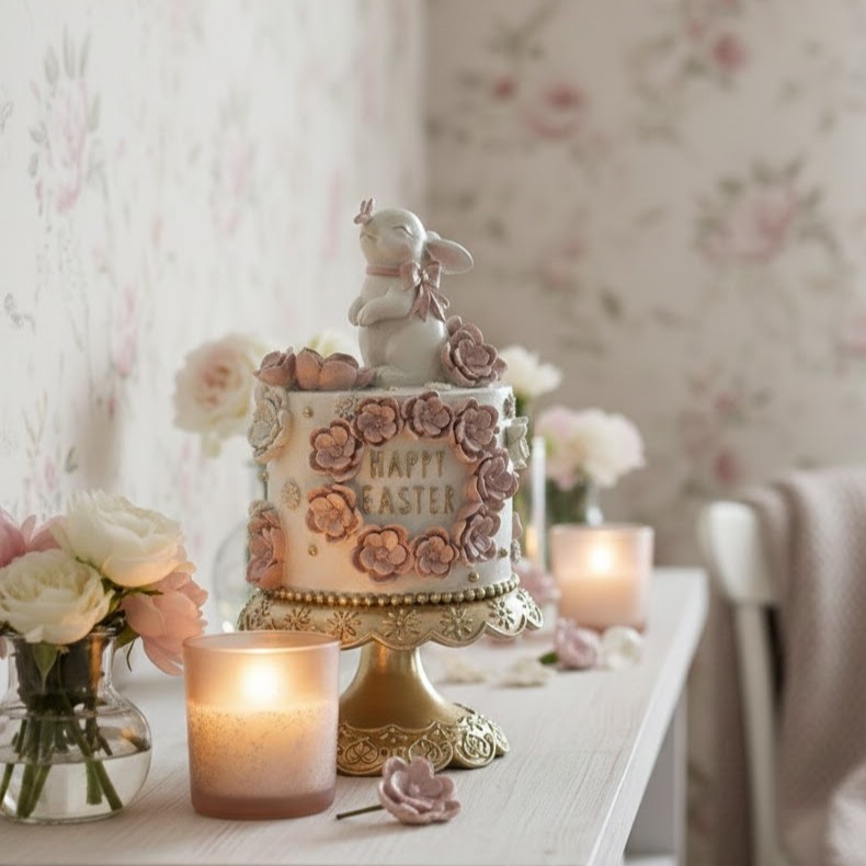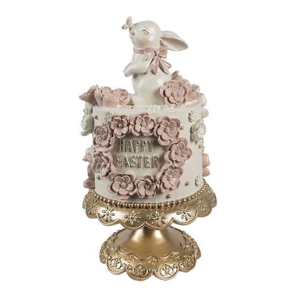Bellissima torta decorativa di Pasqua, realizzata in poliresina e posizionata su un alzatina dorata. La torta è interamente decorata con fiori in rilievo, scritta Happy Easter e dolcissimo coniglietto sul top.