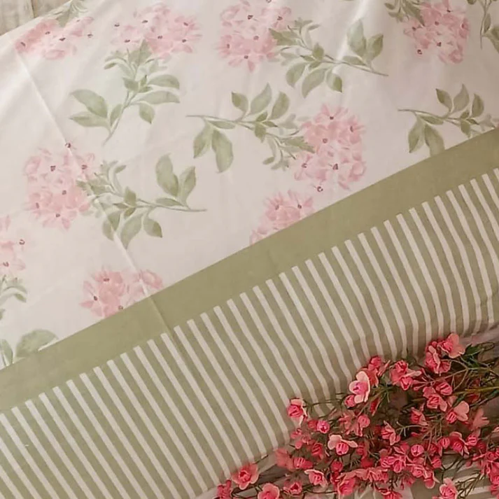 Bellissima parure copripiumino matrimoniale realizzata in puro cotone con stampa floreale su fondo Bianco e righe Verdi.