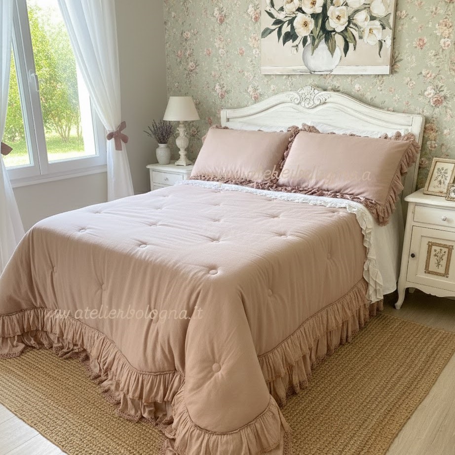Set di 2 meravigliosi copriguanciale, realizzati in puro cotone e impreziositi da doppia rouche in crepe e pizzo sui 4 lati. Di grande impatto, daranno un tocco romantico e super chic alla vostra camera.