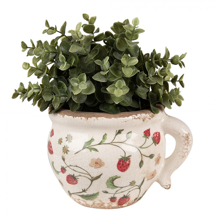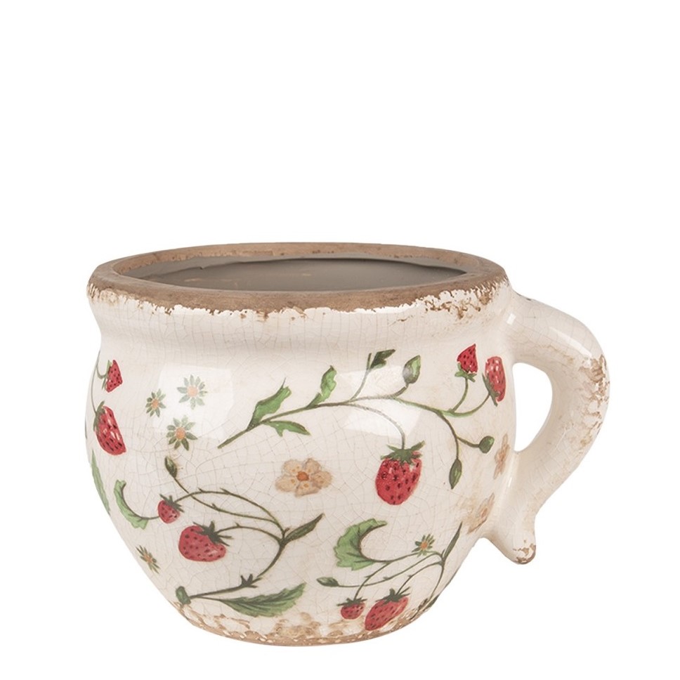 Bellissimo vaso realizzato in ceramica, decorato con motivo di fragoline rosse e antichizzato artigianalmente per conferire un aspetto vissuto.