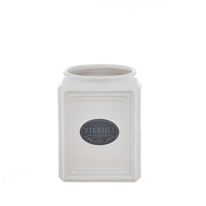 Bellissimo e grande barattolo utensili realizzato in ceramica e decorato con scritta serigrafata.