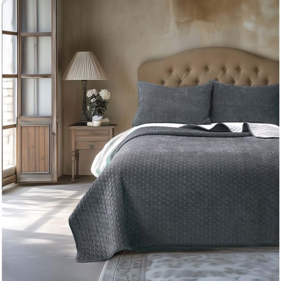 Trapunta matrimoniale in velluto con 2 copriguanciali