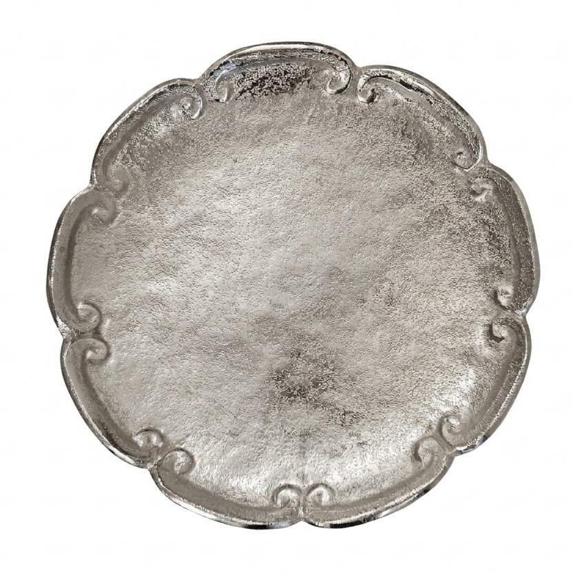 Bellissima alzata realizzata in metallo con finitura argentata a effetto leggermente martellato che gli conferisce un aspetto artigianale.