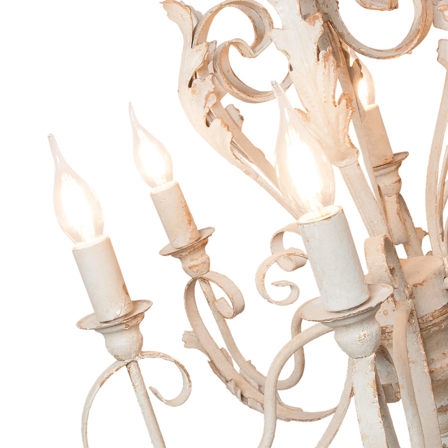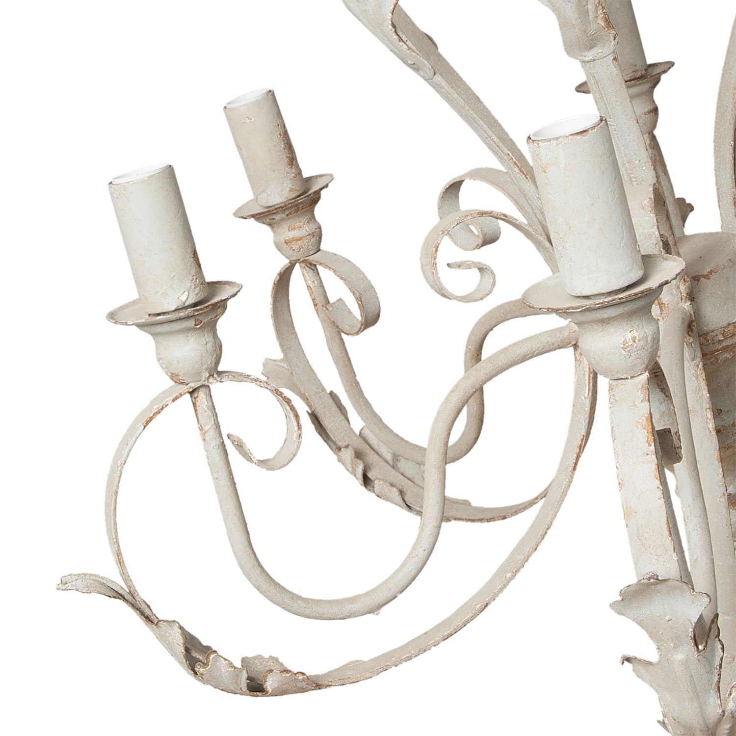 Bellissimo lampadario realizzato in ferro e antichizzato artigianalmente. Ogni braccio è decorato con grandi foglie in ferro. Il colore è Grigio Beige con anticature.