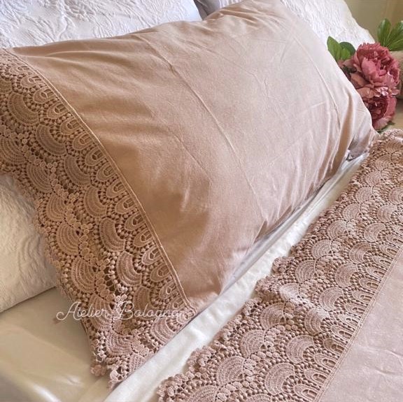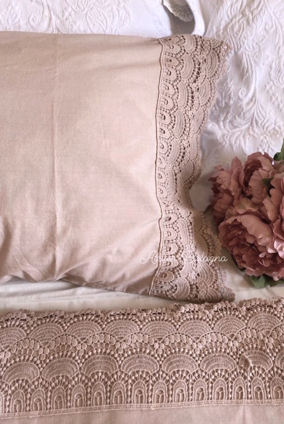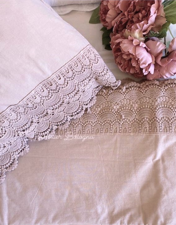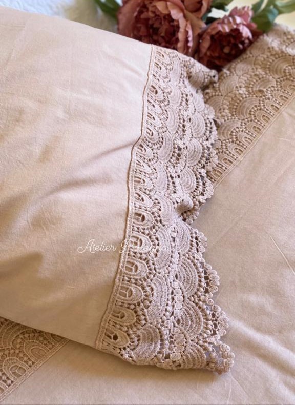 Bellissimo completo letto realizzato in puro cotone di alta qualità. Il lenzuolo sopra è rifinito da un meraviglioso bordo di pizzo, ripreso anche sui lati delle federe. Il colore è Peonia.