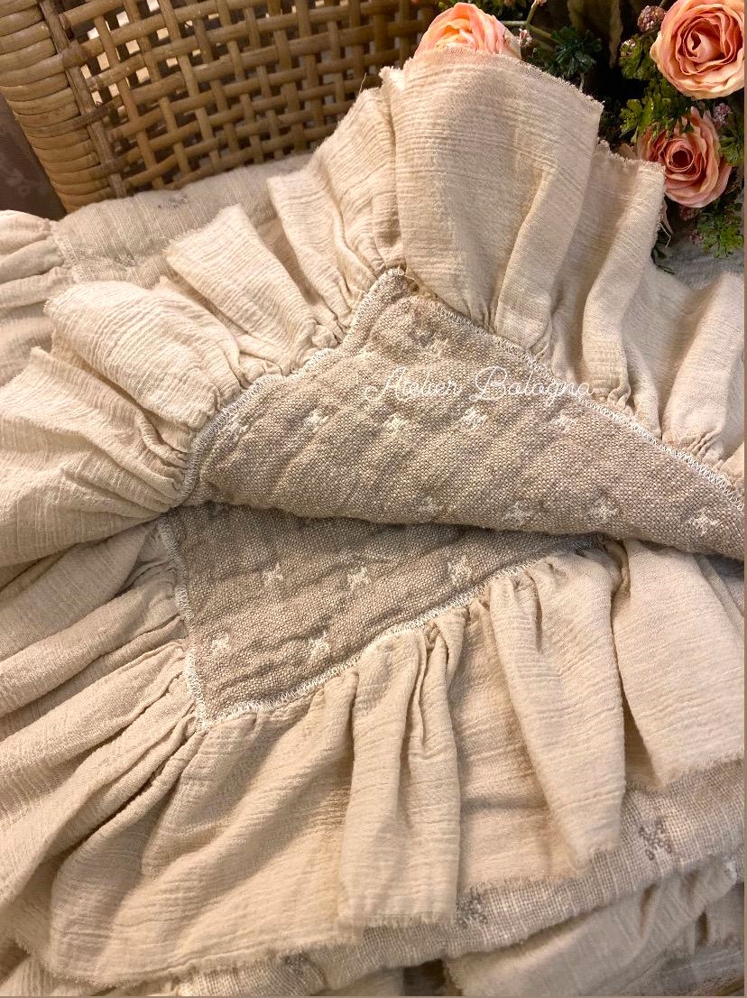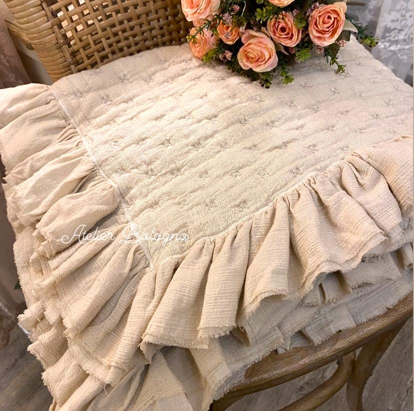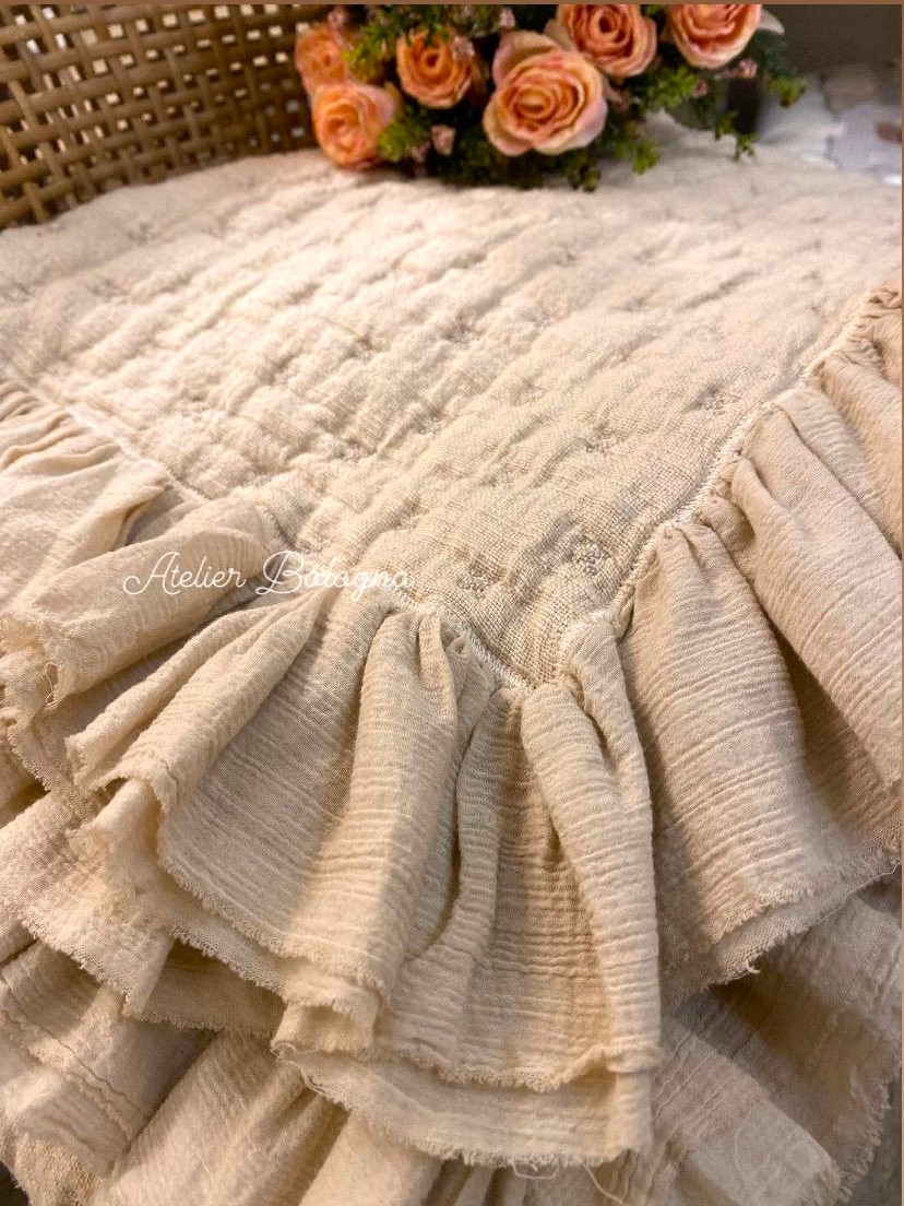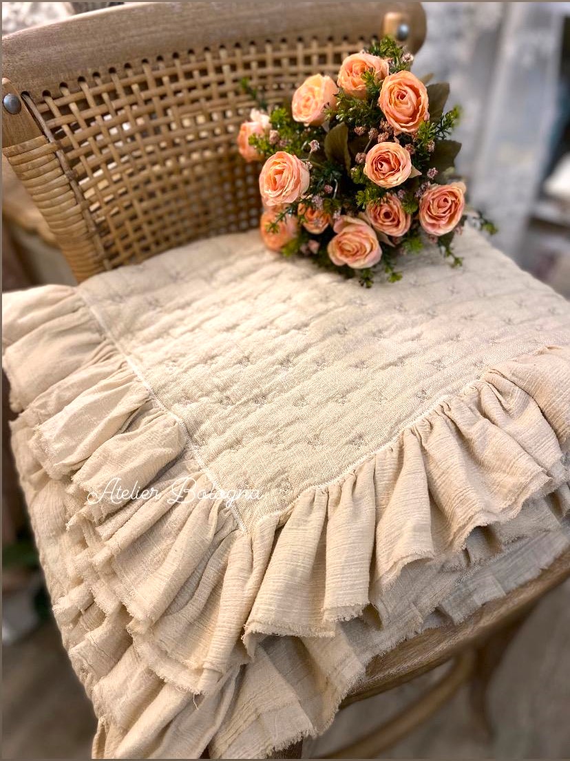 Meraviglioso plaid double face, realizzato in un materico tessuto di puro cotone. La leggera imbottitura (80g) e la tintura in capo, rendono questo articolo estremamente soffice e morbido. Il plaid ha un delicato colore Cipria da un lato e Tortora dall’altro. La trapuntatura è a stellina