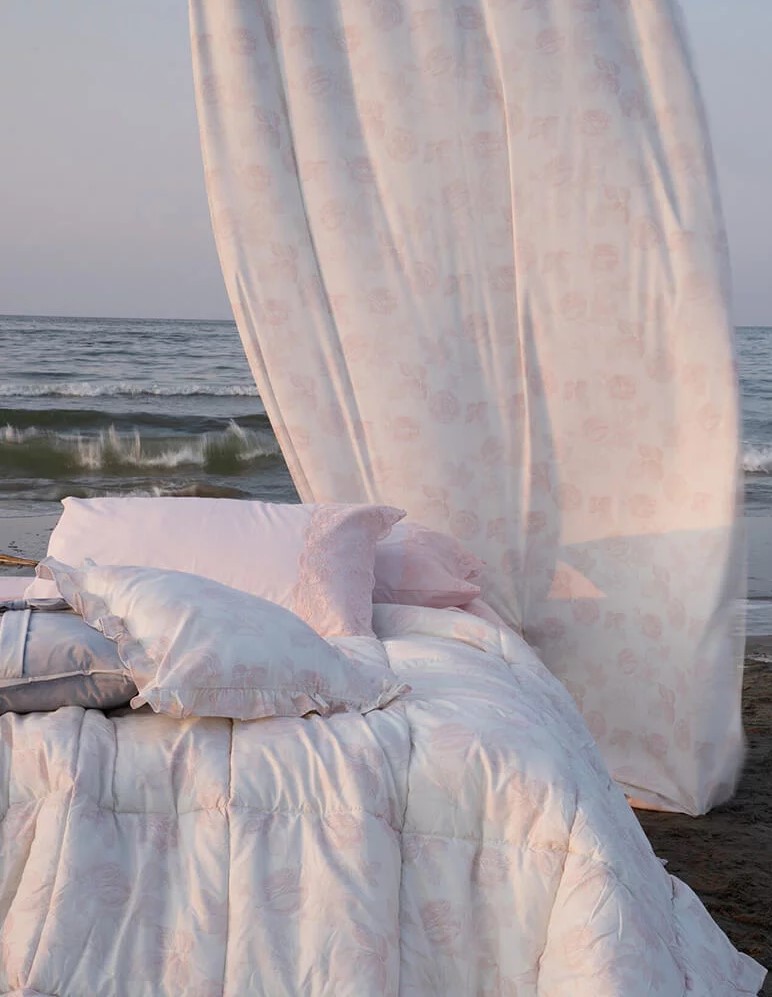Set di 2 bellissime tende realizzate in morbida microfibra con delicato motivo floreale sui toni del Rosa tenue, su base Avorio.