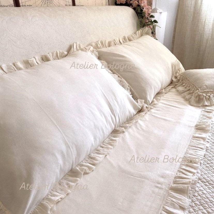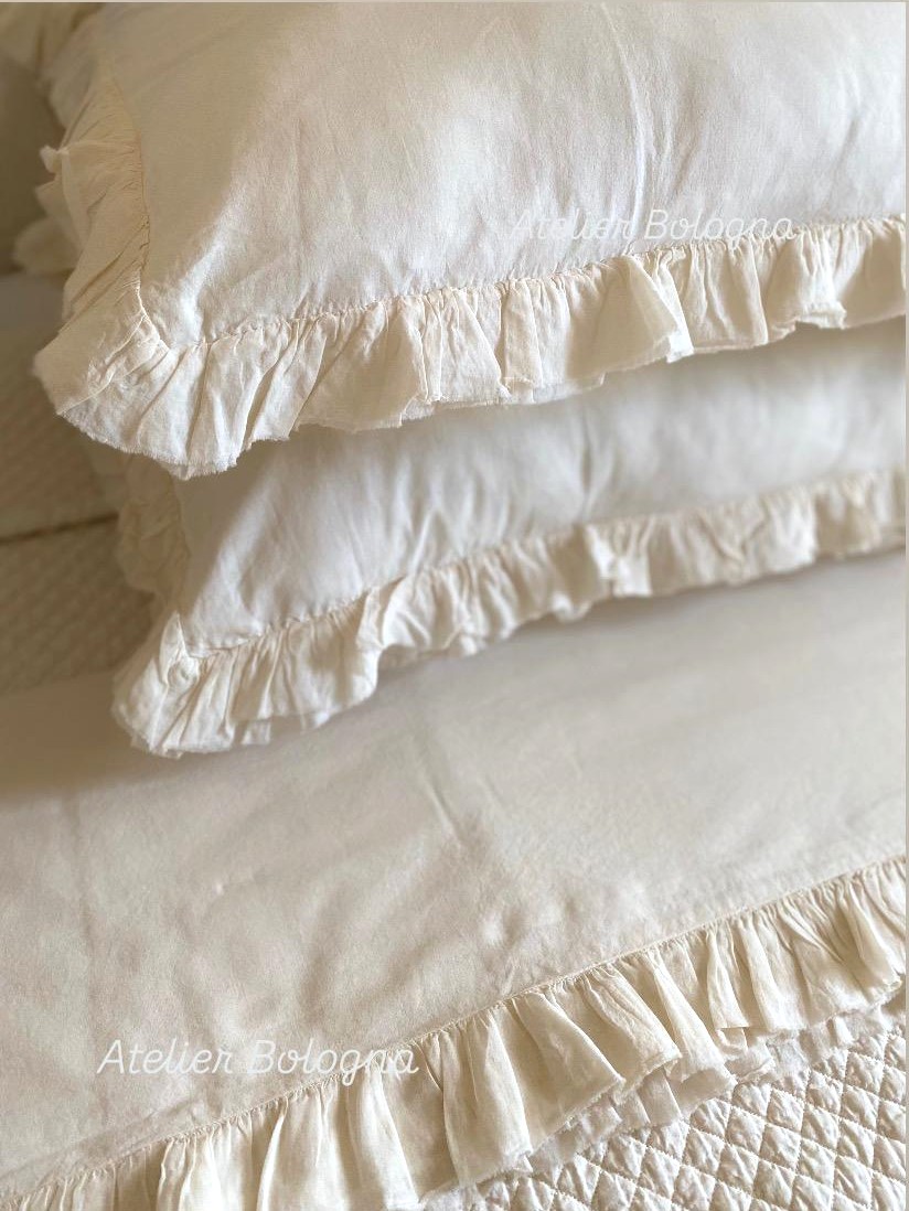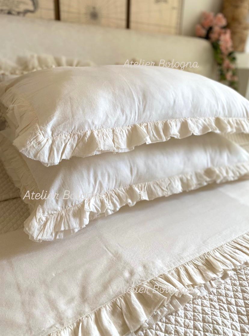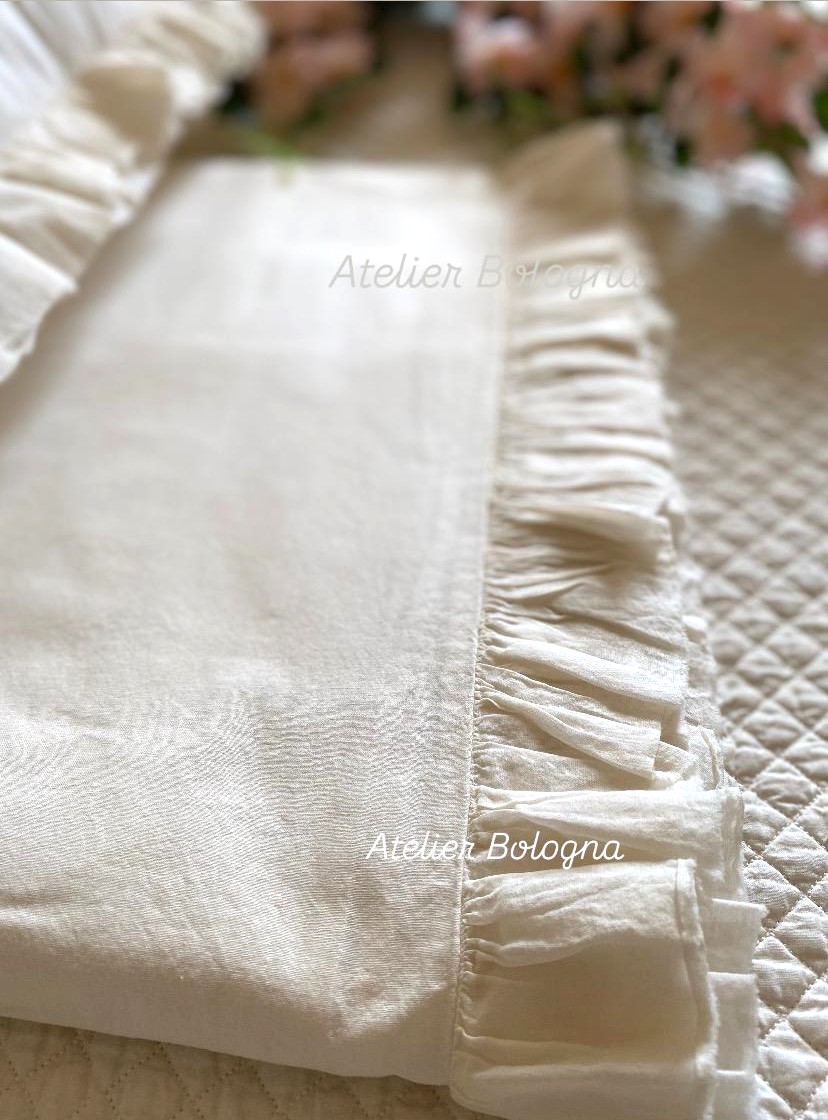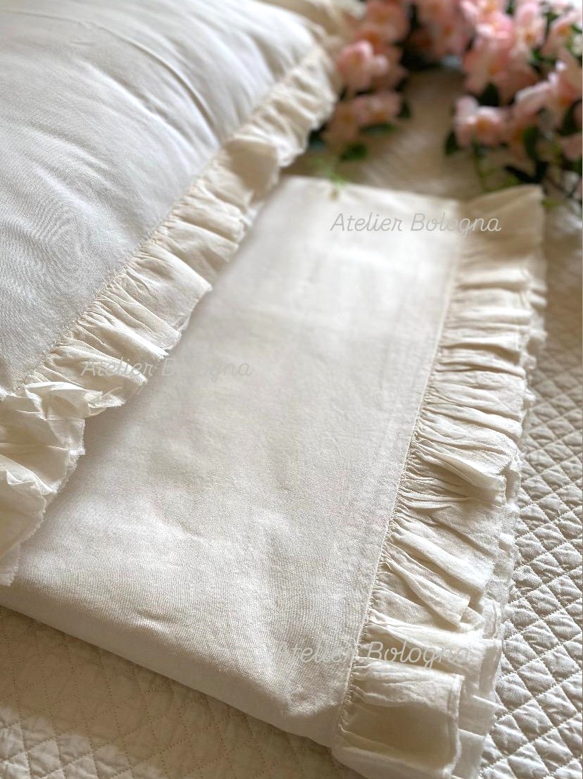 Bellissimo completo letto realizzato in puro cotone di alta qualità. La balza del lenzuolo sopra è rifinito con delicate rouches in garza di cotone riprese anche sui 4 lati delle federe, per un letto raffinato e romantico.