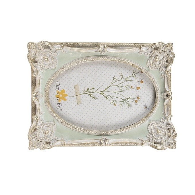 Bellissima cornice realizzata in resina color Verde acquamarina con bordo lavorato in rilievo sui quattro angoli, di color argento con effetto sbiancato