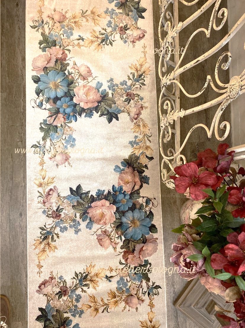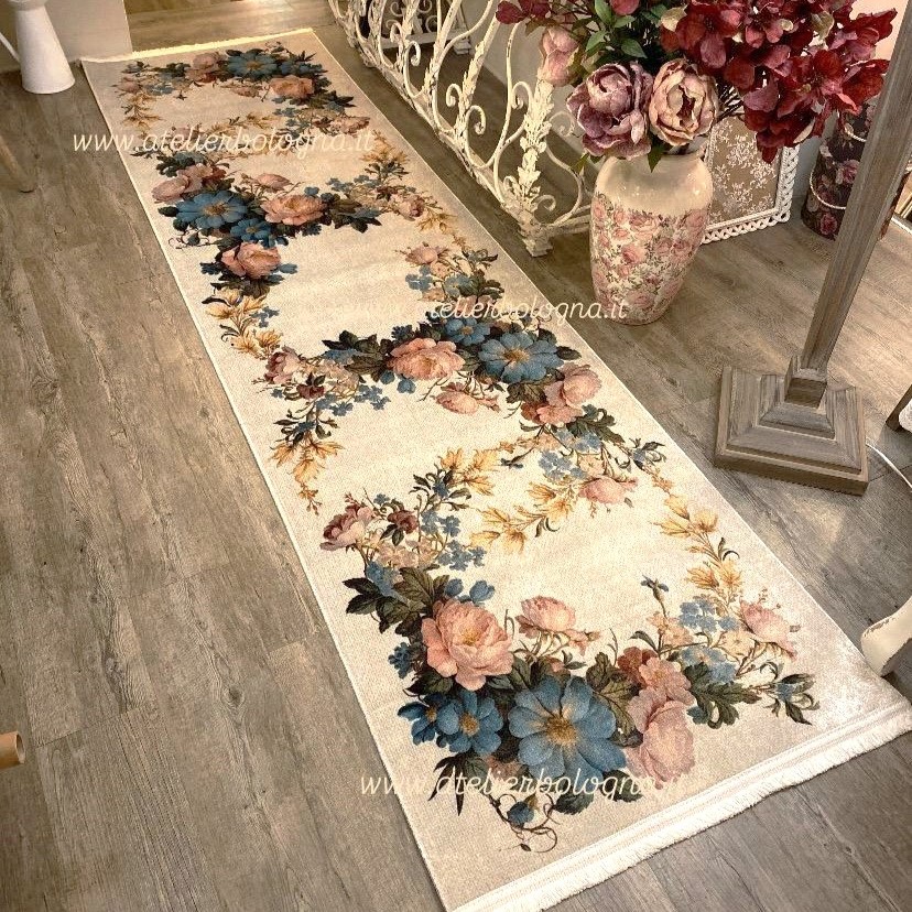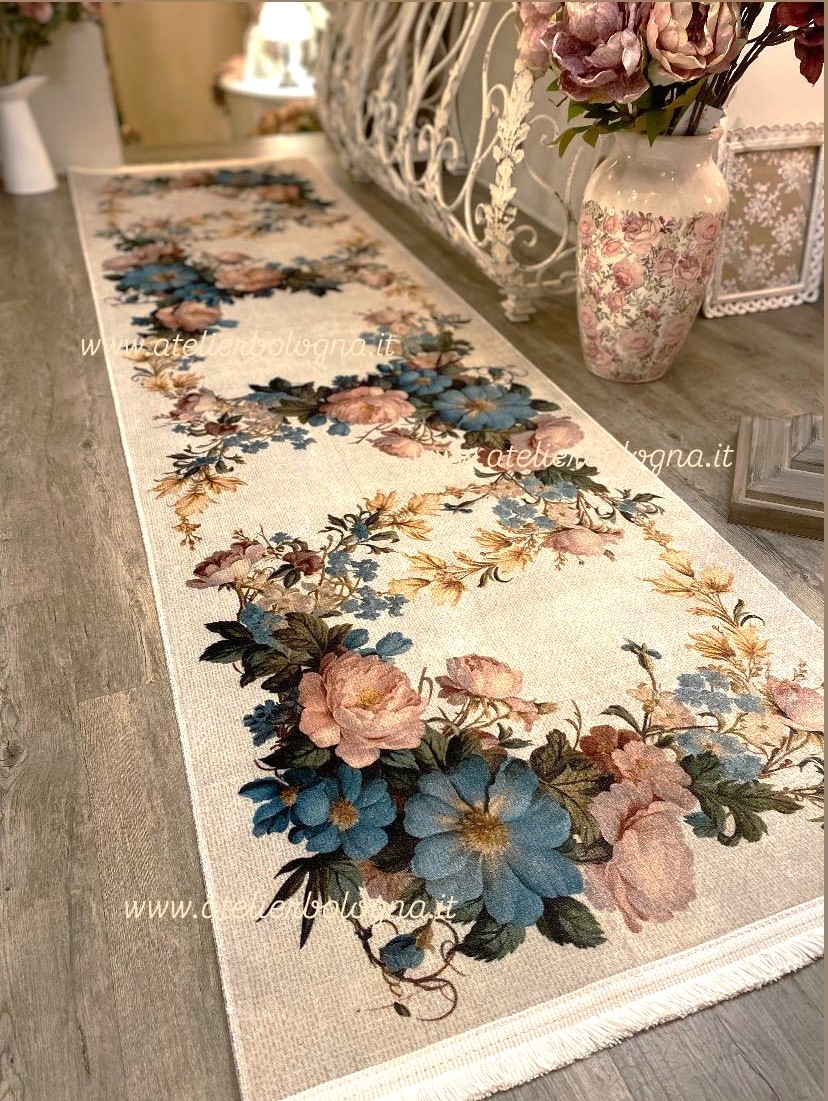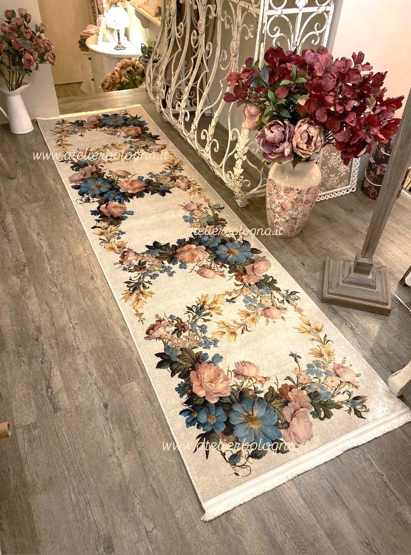 Meraviglioso tappeto/passatoia realizzato in tessuto effetto cinigliato, con bellissima stampa floreale su fondo Avorio, in perfetto stile Vittoriano. E’ rifinito ed impreziosito sui lati corti da un piccolo bordo applicato con frange color Avorio chiaro.