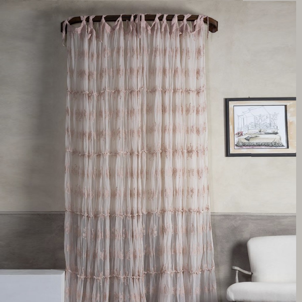 Set di 2 meravigliose e romantiche tende in pizzo, realizzate con tante balze orizzontali di pizzo. Il fascione è in lino con laccetti.