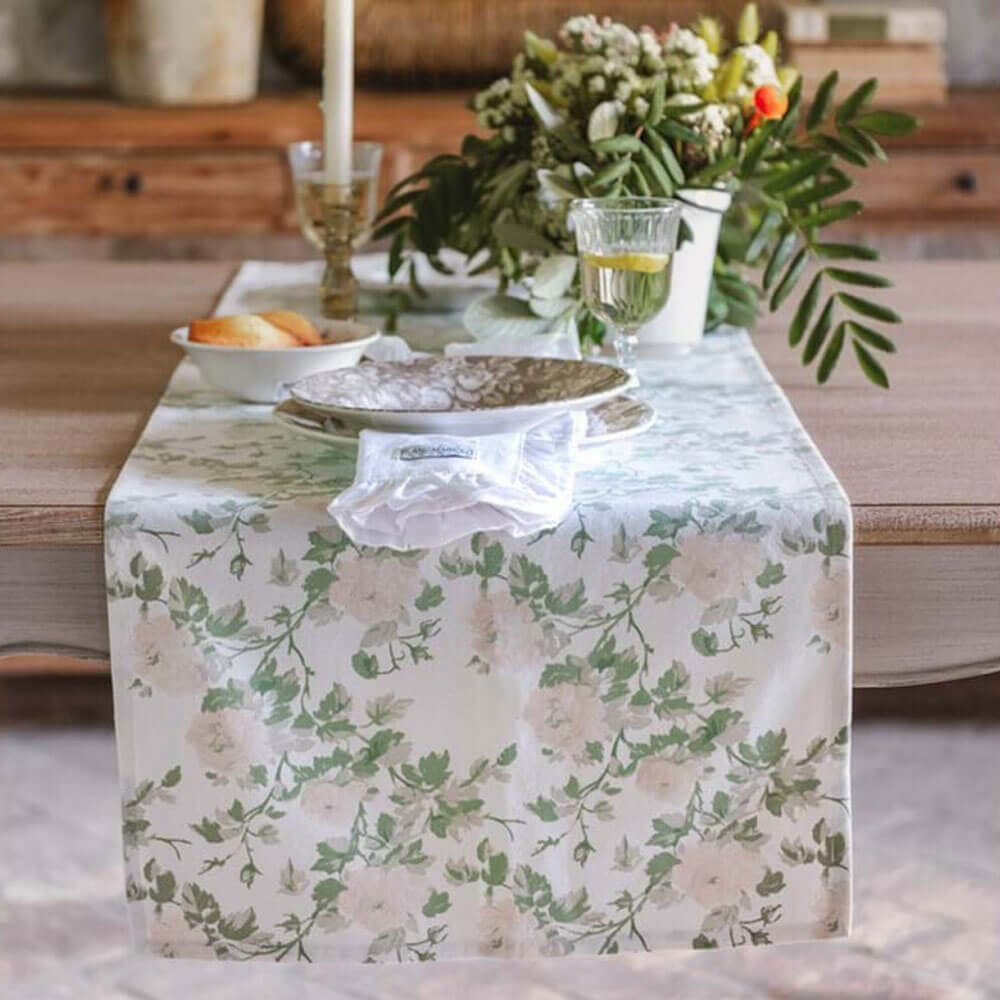 Bellissimo runner realizzato in robusto e soffice tessuto misto cotone dal design sobrio e raffinato, decorato con una romantica fantasia floreale di rose Crema e rametti Verdi su base Panna, che donerà alla tavola un tocco fresco ed elegante.
