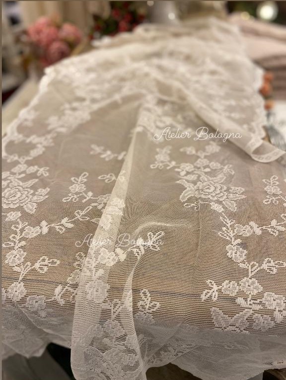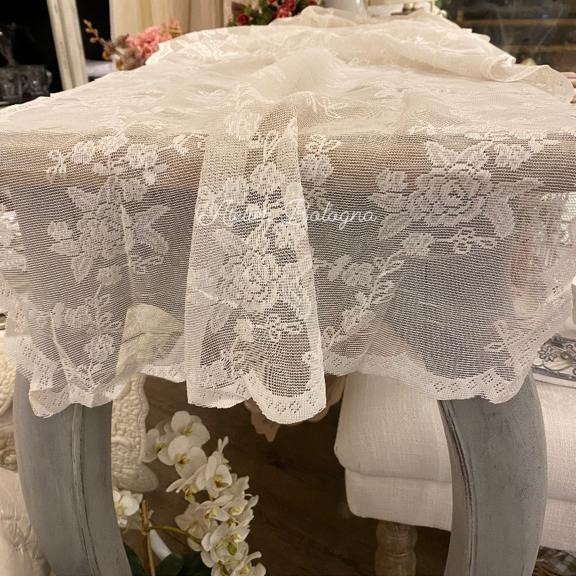 Delizioso Runner realizzato interamente in pizzo con delicato disegno di rose e bordo smerlato. Variante Avorio