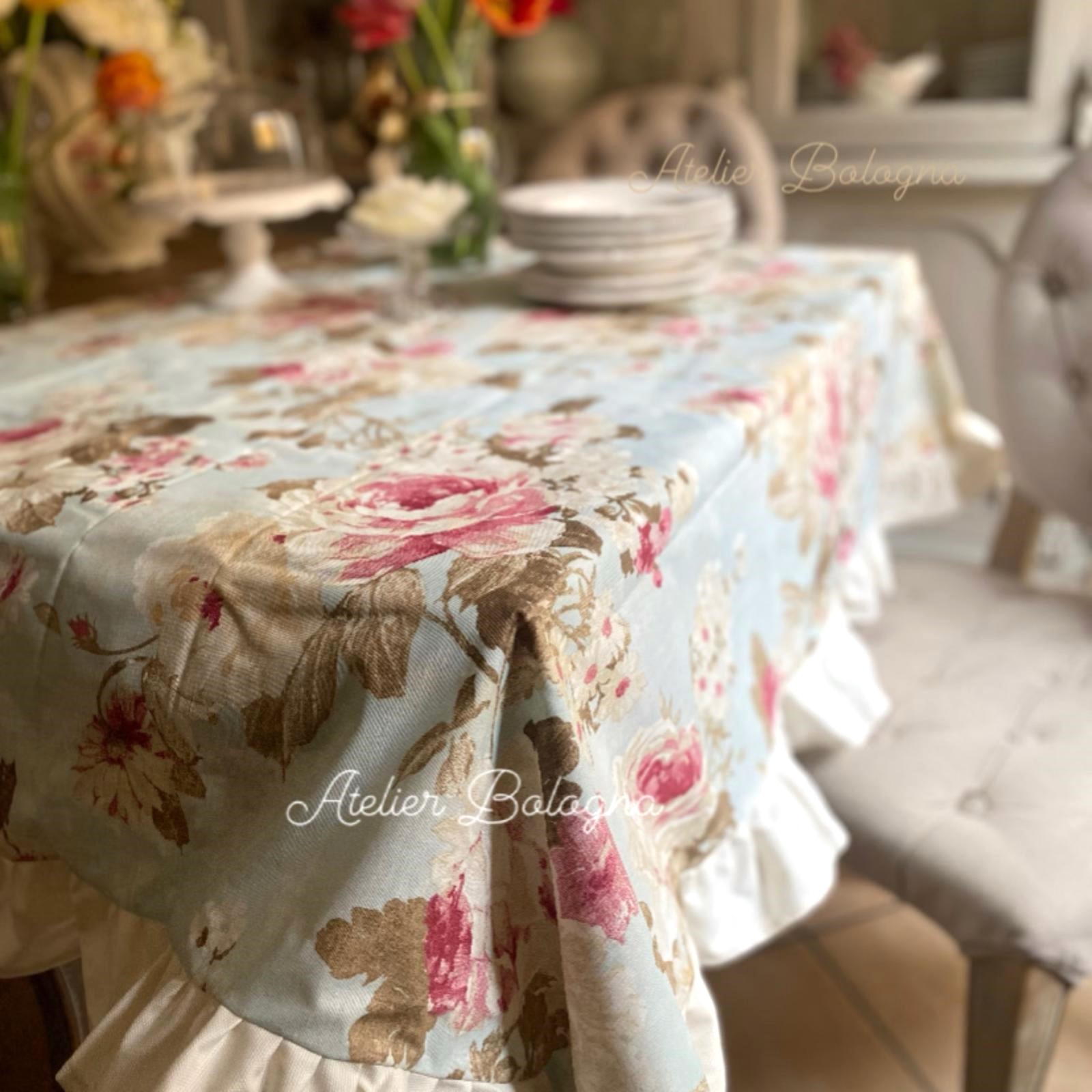 Bellissima e pratica tovaglia RESINATA decorata con motivo floreale su base Azzurro tenue e frill in tinta unita Beige