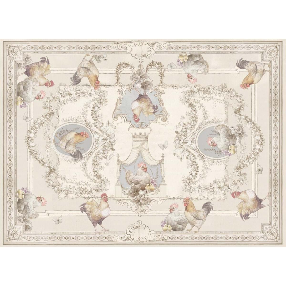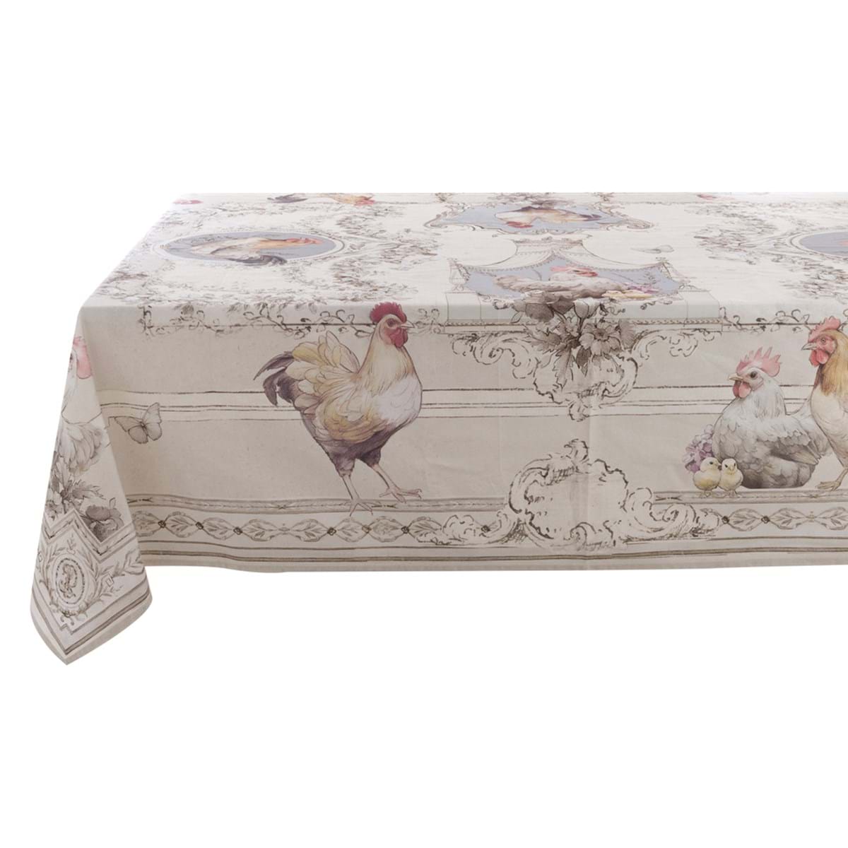Bellissima tovaglia realizzata in puro cotone con meravigliose e delicate illustrazioni di galli, galline e pulcini, incorniciate da motivi ornamentali classici, che le rendono adatta ad uno stile Country ma Chic.