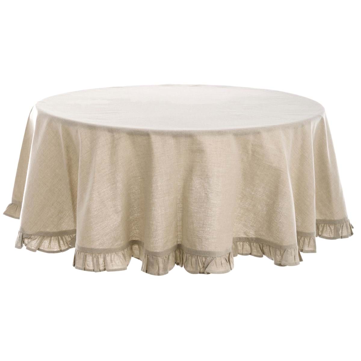 Bellissima tovaglia rotonda realizzata in tessuto misto cotone, con piccola rouche sui 4 lati. Colore Beige