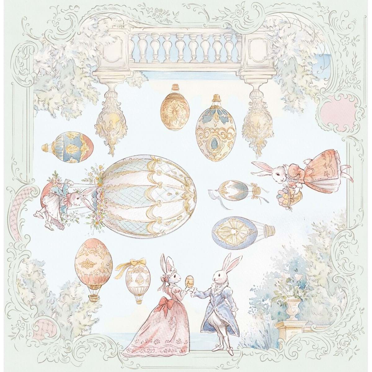 Bellissimo foulard porta uovo realizzato in puro cotone con meravigliose e delicate illustrazioni di uova mongolfiera, finemente decorate e conigli in vesti classiche, ambientati in un incantato giardino settecentesco.