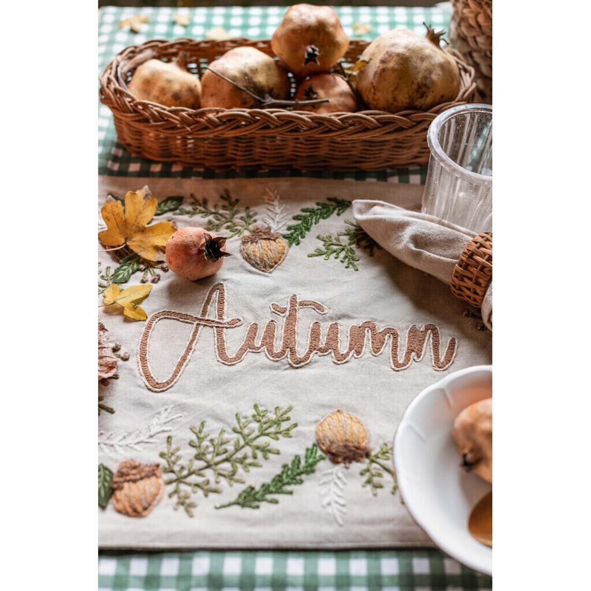Splendida tovaglietta realizzata in puro cotone, impreziosita con splendidi ricami a rilievo di rametti e ghiande nel classico tema autunnale