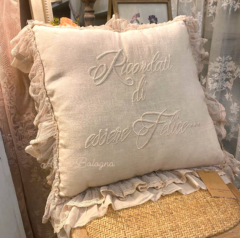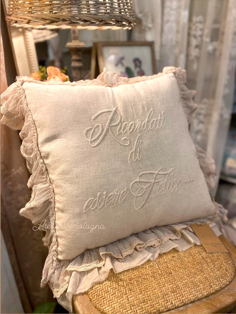 Meraviglioso cuscino realizzato artigianalmente in lino, con ricamo centrale “Ricordati di essere Felice”.