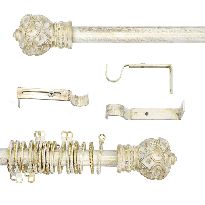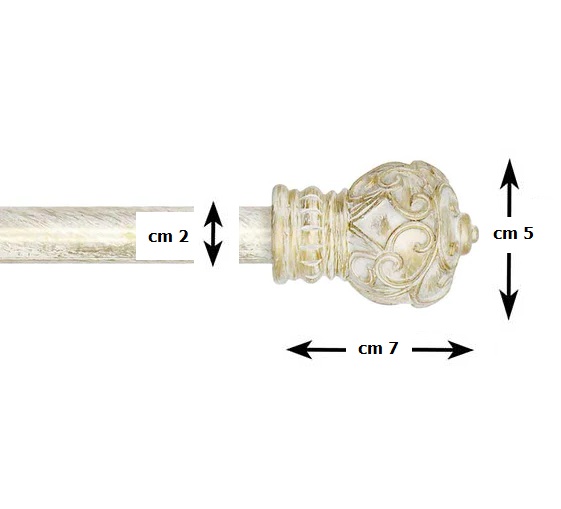 Bellissimo bastone per tende, realizzato in ferro con terminali decorati a rilievo. Il colore è Avorio e Oro con effetto anticato, particolarmente elegante e raffinato.